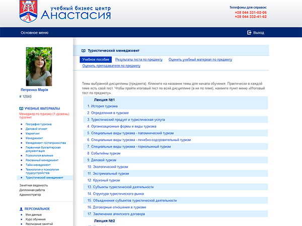 У ході занять також навчання користування офісною технікою: прийом, надсилання факсу, сканування, друк, копіювання, користування Інтернетом, користування електронною поштою, користування ICQ. Самостійна робота: розробка туристичного маршруту, складання програми перебування та розрахунок вартості туру. Продаж туру потенційному клієнту |